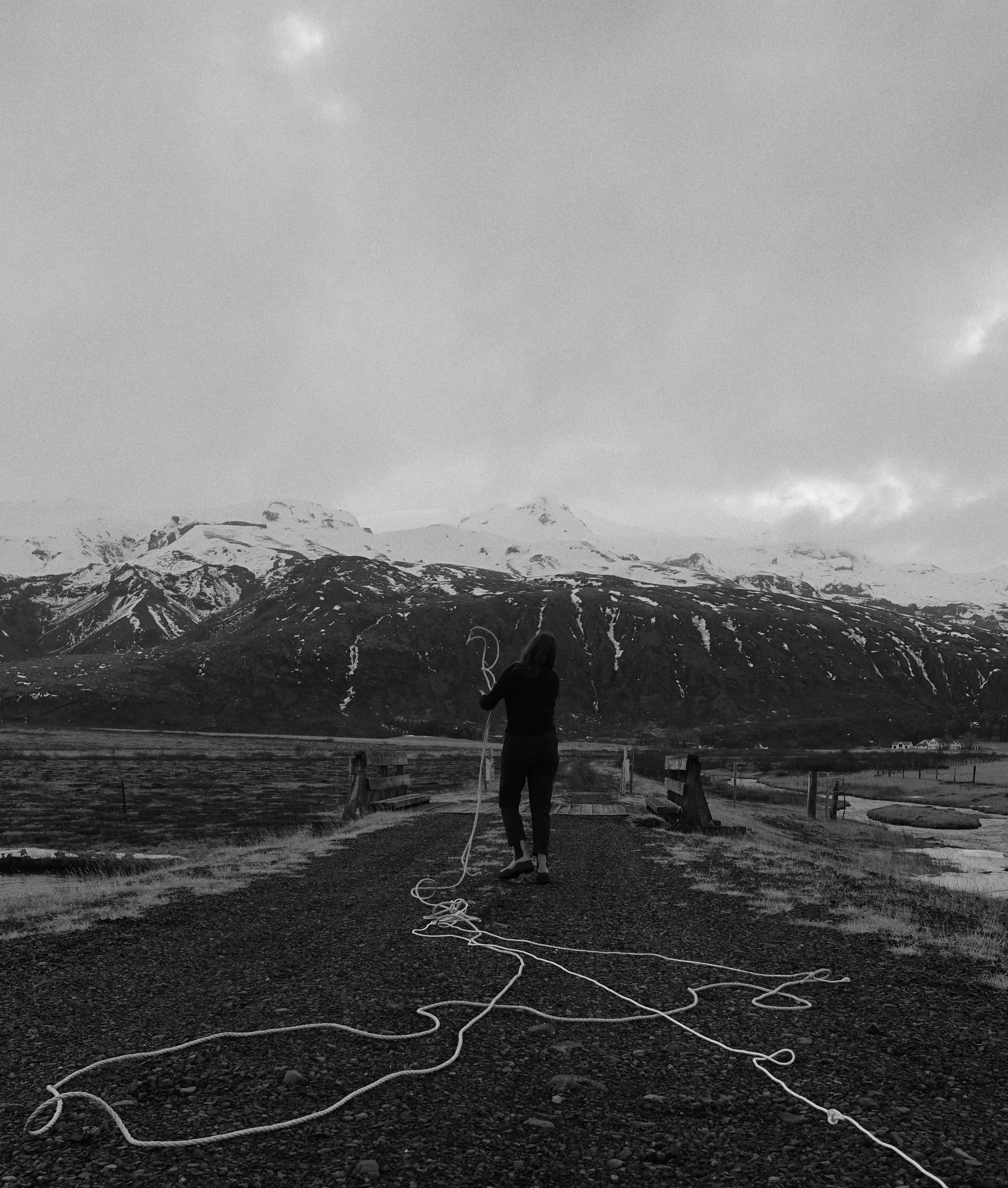 Utilizing a rope, I tracked my location and trail while walking in Iceland. We display life’s movement, and inherently it's chaos, unpredictability, and entropy by existing. Through carrying a rope and repeating these patterns of mapping, we also display the behaviors that we submit to illogically and the randomness of our day and night. After using a straight line of rope, we may come across that the rope becomes entangled, circular, patterned, and goes nowhere, yet is a paradox as it becomes part of a greater landscape. This could show us that our movements have ramifications, are disorderly even if perceived as organized, and we should not forget the intangible.